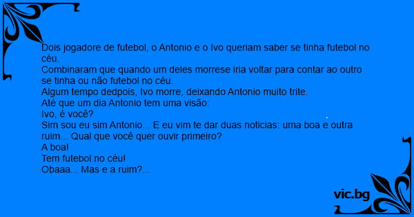 Tinham dois amigos que gostavam de jogar futebol um deles morreu. Mas um dia ele voutou para falar uma coisa para o amigo. — Eu tenho uma noticia boa e ruim pra te dar. — A boa e que no ceu tem...