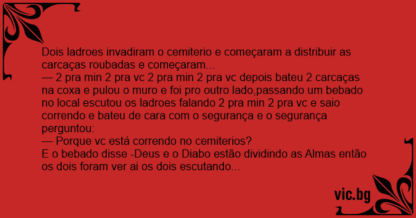 — 2 pra min 2 pra vc 2 pra min 2 pra vc depois bateu 2 carcaças na coxa e pulou o muro e foi pro outro lado,passando um bebado no local escutou os ladroes falando 2 pra min 2 pra vc e saio correndo e bateu de cara com o segurança e o segurança perguntou: