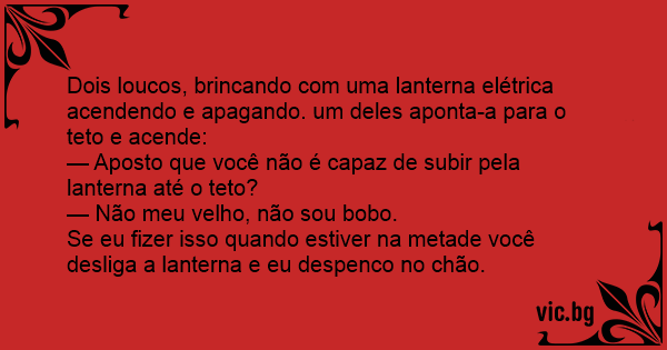 Dois loucos, brincando com uma lanterna elétrica acendendo e apagando. um deles aponta-a para o teto e acende: