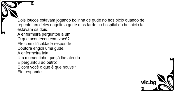 Dois loucos estavam jogando bolinha de gude no hos рiсiо quando de repente um deles engoliu a gude mas tarde no hospital do hospicio lá estavam os dois.