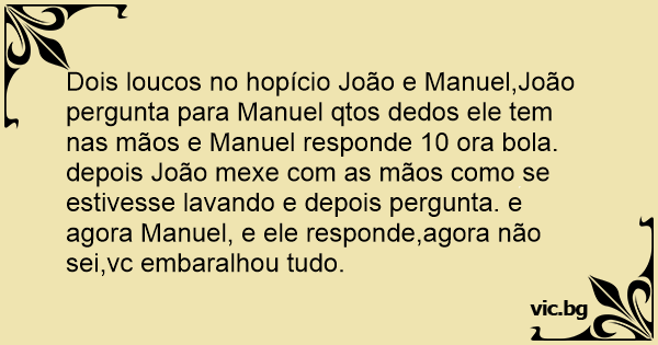 Dois loucos no hopício João e Manuel,João pergunta para Manuel qtos dedos ele tem nas mãos e Manuel responde 10 ora bola. depois João mexe com as mãos como se estivesse lavando e depois pergunta. e agora Manuel, e ele responde,agora não sei,vc embaralhou tudo.