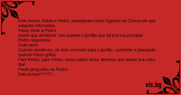 Dois loucos, Paulo e Pedro, planejavam como fugiriam da Clinica em que estavam internados.