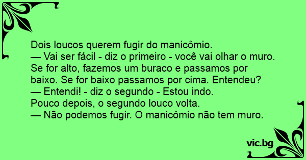 — Vai ser fácil - diz o primeiro - você vai olhar o muro. Se for alto, fazemos um buraco e passamos por baixo. Se for baixo passamos por cima. Entendeu?