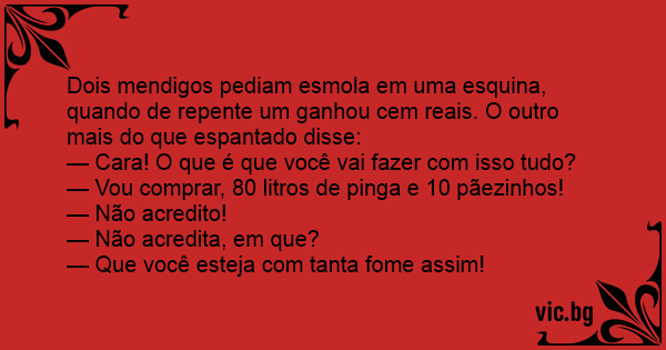 Dois mendigos pediam esmola em uma esquina, quando de repente um ganhou cem reais. O outro mais do que espantado disse: