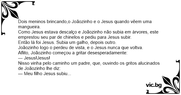 Como Jesus estava descalço e Joãozinho não subia em árvores, este emprestou seu par de chinelos e pediu para Jesus subir.