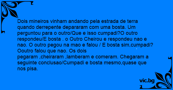 Dois mineiros vinham andando pela estrada de terra quando derrepente depararam com uma bosta. Um perguntou para o outro/Que e isso cumpadi?O outro respondeu/E bosta . o Outro Cheirou e respondeu nao e nao. O outro pegou na mao e falou / E bosta sim,cumpadi? Ooutro falou que nao. Os dois pegaram ,cheiraram ,lamberam e comeram. Chegaram a seguinte conclusao/Cumpadi e bosta mesmo,quase que nos pisa.