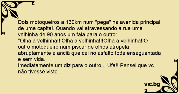 Dois motoqueiros a 130km num "pega" na avenida principal de uma capital. Quando vai atravessando a rua uma velhinha de 90 anos um fala para o outro: