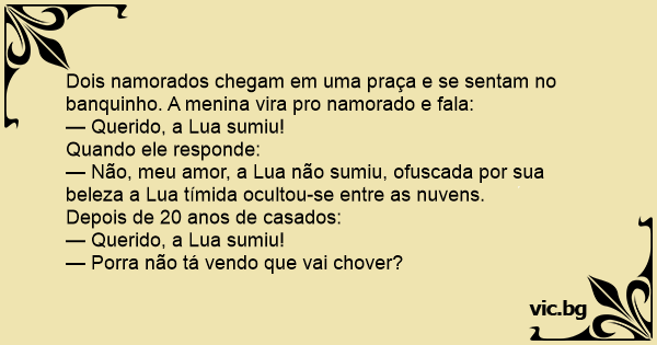 Dois namorados chegam em uma praça e se sentam no banquinho. A menina vira pro namorado e fala: