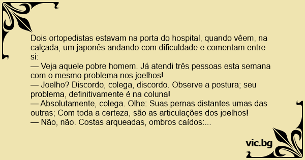 — Meu senhor, com licença, estávamos observando o seu modo de andar e ficamos curiosos. O meu amigo aqui acha que o seu problema é nas pernas e eu tenho certeza que são suas costas. Afinal, qual dos dois acertou?