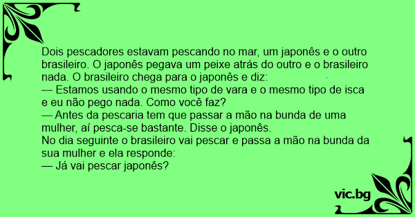 Dois pescadores estavam pescando no mar, um japonês e o outro brasileiro. O japonês pegava um peixe atrás do outro e o brasileiro nada. O brasileiro chega para o japonês e diz: