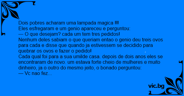 Nenhum deles sabiam o que queriam entao o genio deu treis ovos para cada e disse que quando ja estivessem se decidido para quebrar os ovos e fazer o pedido!
