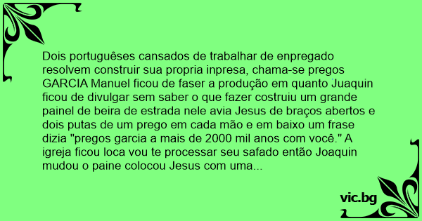 Dois portuguêses cansados de trabalhar de enpregado resolvem construir sua propria inpresa, chama-se pregos GARCIA Manuel ficou de faser a produção em quanto Juaquin ficou de divulgar sem saber o que fazer costruiu um grande painel de beira de estrada nele avia Jesus de braços abertos e dois putas de um prego em cada mão e em baixo um frase dizia "pregos garcia a mais de 2000 mil anos com você." A igreja ficou loca vou te processar seu safado então Joaquin mudou o paine colocou Jesus com uma mão pregadas e a outra acenava dissemdo agora você sabe quais são os pregos Garcias em. Nova mente a igreja ficou indiguinada com ele ai então ele nova mente mudou o painel desta ves colocando uma grande cruz no meio do painel e em baixo uma frase dizia se você tivese usado pregos Garcia ele não teria fugido.