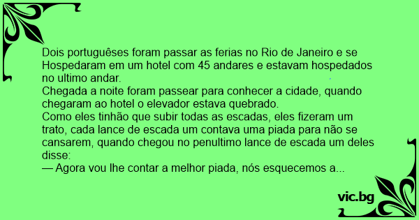 Dois portuguêses foram passar as ferias no Rio de Janeiro e se Hospedaram em um hotel com 45 andares e estavam hospedados no ultimo andar.