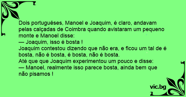 Dois portuguêses, Manoel e Joaquim, é claro, andavam pelas calçadas de Coimbra quando avistaram um pequeno monte e Manoel disse:
