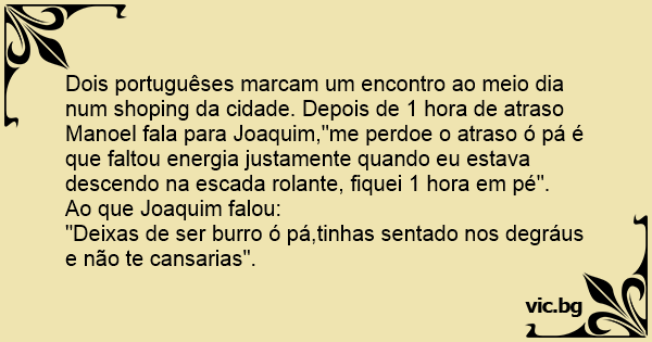 Dois portuguêses marcam um encontro ao meio dia num shoping da cidade. Depois de 1 hоrа de atraso Manoel fala para Joaquim,"me perdoe o atraso ó pá é que faltou energia justamente quando eu estava descendo na escada rolante, fiquei 1 hоrа em pé".