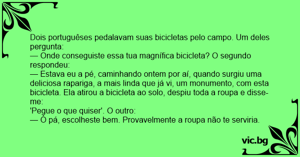 Dois portuguêses pedalavam suas bicicletas pelo campo. Um deles pergunta: