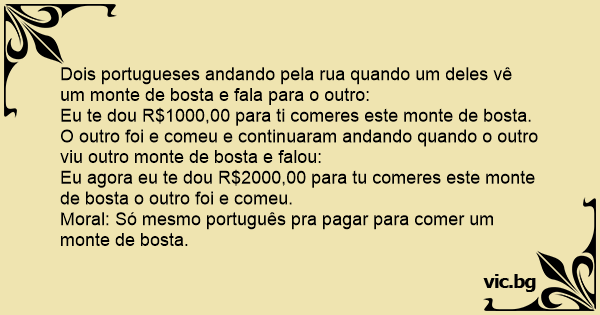 Dois portugueses andando pela rua quando um deles vê um monte de bosta e fala para o outro: