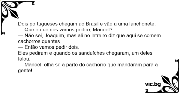 — Não sei, Joaquim, mas ali no letreiro diz que aqui se comem cachorros quentes.