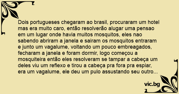 Dois portugueses chegaram ao brasil, procuraram um hotel mas era muito caro, então resolverão alugar uma pensao em um lugar onde havia muitos mosquitos, eles nao sabendo abriram a janela e sairam os mosquitos entraram e junto um vagalume, voltando um pouco embreagados, fecharam a janela e foram dormir, logo começou a mosquiteira então eles resolveram se tampar a cabeça um deles viu um reflexo e tirou a cabeça pra fora pra espiar, era um vagalume, ele deu um pulo assustando seu outro companheiro e disse: