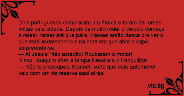 Dois portugueses compraram um Fusca e foram dar umas voltas pela cidade. Depois de muito rodar o veículo começa a ratear, ratear até que para. Manoel então desce pra ver o que está acontecendo e na hоrа em que abre o capô, surpreende-se: