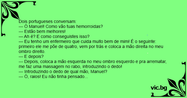 — Eu tenho um enfermeiro que cuida muito bem de mim! É o seguinte: primeiro ele me põe de quatro, vem por trás e coloca a mão direita no meu ombro direito.