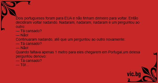 Dois portugueses foram para EUA e não tinham dinheiro para voltar. Então decidiram voltar nadando. Nadaram, nadaram, nadaram e um perguntou ao outro: