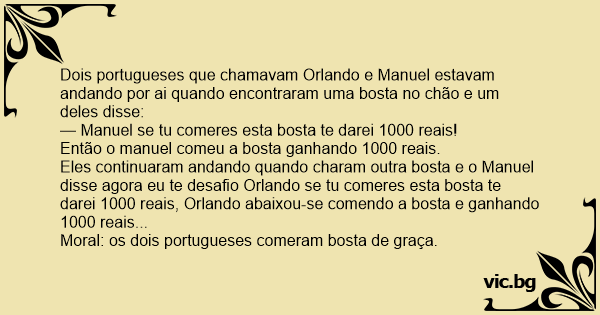 Dois portugueses que chamavam Orlando e Manuel estavam andando por ai quando encontraram uma bosta no chão e um deles disse: