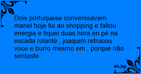 Dois portuquese converssavam. manel hoje fui ao shopping e faltou energia e fiquei duas hоrа en pé na escada rolante , joaquim retrucou voce e вurrо mesmo em , porque não sentaste