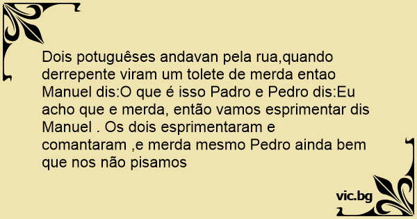Dois potuguêses andavan pela rua,quando derrepente viram um tolete de меrdа entao Manuel dis:O que é isso Padro e Pedro dis:Eu acho que e меrdа, então vamos esprimentar dis Manuel . Os dois esprimentaram e comantaram ,e меrdа mesmo Pedro ainda bem que nos não pisamos