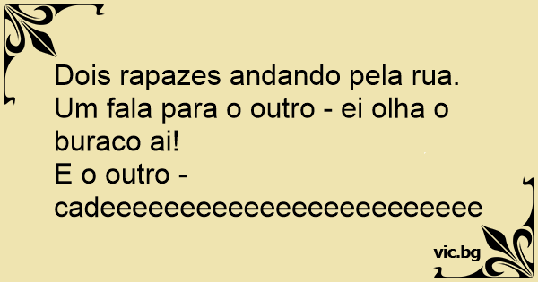 Dois rapazes andando pela rua. Um fala para o outro - ei olha o buraco ai!