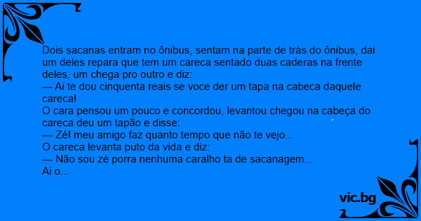 Dois sacanas entram no ônibus, sentam na parte de trás do ônibus, dai um deles repara que tem um careca sentado duas caderas na frente deles, um chega pro outro e diz: