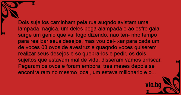 Dois sujeitos caminham pela rua auqndo avistam uma lampada magica. um deles pega alampada e ao esfre gala surge um genio que vai logo dizendo. nao ten- nho tempo para realizar seus desejos, mas vou dei- xar para cada um de voces 03 ovos de avestruz e quaqndo voces quiserem realizar seus desejos e so quebra-los e pedir. os dois sujeitos que estavam mal de vida, disseram vamos arriscar. Pegaram os ovos e foram embora. tres meses depois se encontra ram no mesmo local, um estava milionario e o ou- tro estava mais pobre ainda. O milionario pergun- tou. O que houve, Nào funcionou os ovos pois os meus tres pedidos eu fiz, quebrei os ovos e deu certo. o outro disse, nem te conto, sabe minha ca sa, tem um sarrafo na entrada, eu entrei com os ovos na mão tropiquei e caiu um ovo e eu disse: