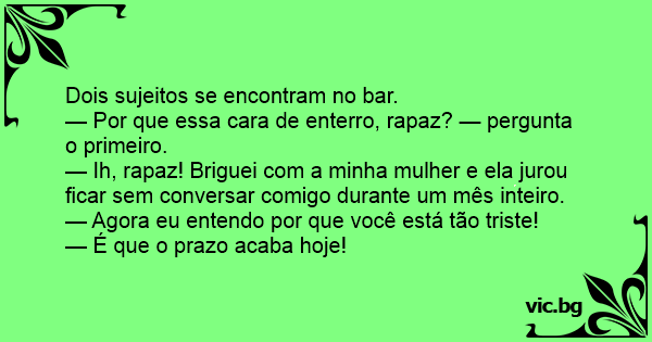 — Ih, rapaz! Briguei com a minha mulher e ela jurou ficar sem conversar comigo durante um mês inteiro.