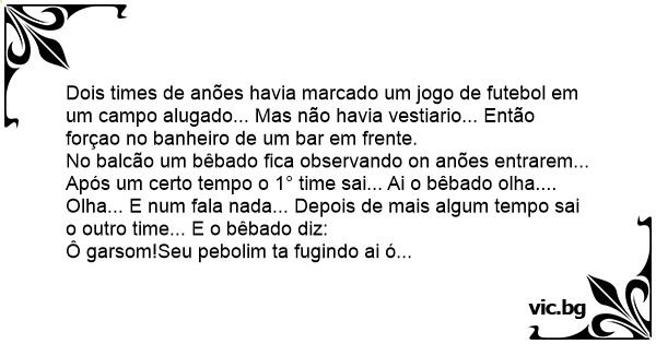 No balcão um bêbado fiса observando on anões entrarem... Após um certo tempo o 1° time sai... Ai o bêbado olha.... Olha... E num fala nada... Depois de mais algum tempo sai o outro time... E o bêbado diz: