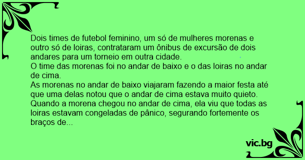 Deux équipes féminines de hand sont dans un bus à deux étages. Au rez-de-chaussée, une équipe de brunes fait la fête dans tous les sens. Two bowling teams, one of all Blondes and one of all Brunettes, charter a double-decker bus for a weekend bowling tournament in Atlantic City. The Brunette team rides in the bottom of the bus. The... Temel ile Dursun iki katlı otobüsle seyahat ediyordu. Üst kattaki Temel bir ara cep telefonunu çıkardı ve alt kattaki Dursun'u aradı: - Tursun, orada durum nasıl? - "Hiiç! Bizim şoför uyumuş,... Entra un atlante en un autobús de dos pisos y estaba lleno, entonces se agarra a una barra del autobús. Al rato va el jefe y le dice: Se puede usted subir al piso de arriba, por favor. El atlante... A rendőrök és a tűzoltók egy közös kiránduláson vesznek részt. Egy emeletes buszt kapnak, melyben alul a tűzoltók, az emeleten a rendőrök utaznak. Pár óra után a tűzoltók parancsnoka felmegy a... Ole och Marit var i England och skulle åka de berömda dubbeldäckarna. Marit satte sig därnere och Ole däruppe, men han kom snabbt ner. - Fick du svindel där uppe? - Nej, men det fanns ingen... Sarunājas divi beļģi. - Kad būsi Londonā, Redzēsi divstāvīgus autobusus. Braucot tajos, Sēdies pirmajā stāvā, Jo otrajā nav šofera… Deux belges visitent Londres pour la première fois. Ils montent dans un autobus rouge à impériale et s'installent au niveau inférieur. Quelques minutes plus tard, l'un deux dit : - Je vais monter... C’est deux belges qui visitent Londres et ils décident de prendre les fameux bus rouges à 2 étages. Ils se mettent en bas et, tout à coup, l’un dit à l’autre : - J’vais voir en haut comment c’est.... Em um ônibus de dois andares um velhinho machuca uma senhora. Passa o caminho a cutucá- la. Então a velha diz: Porque o senhor não vai lá em cima? Não tem ninguém. Pelo o menos o senhor não vai... Portuguêses e Brasileiros estavam fazendo uma viagem em um ônibus de dois andares, para melhor distribuição o motorista resolveu o seguinte. Os Brasileiros vão na andar de baixo, e os Portuguêses... Um grupo de vinte mulheres foram fazer uma viagem, 10 morenas e 10 loiras,o ônibus era leito (de dois andares). Assim decidiram que as morenas em baixo e as loiras em cima. Ai as morenas só fazendo... Havia um ônibus de 2 andares,aqueles que tam em cima e embaixo. Em cima só tinha loiras e embaixo só morenas. As morenas estam se divertindo,fazendo a festa,o maior barulho. Depois de um tempo uma... Num ônibus de dois andaras estavam as loiras no andar de cima eas morenas no andar debaixo curtindo pagode enquanto as loiras gritaram>O motorista foi lä em cima ver o que tinha avido: — O que está... Uma equipe de loira e outra de morena vao viajar em um onibus de dois andares. As loiras foram no andar de cima e as morenas no de baixo. E as moresnas estavam na maior bagunsa e as loiras estavam... Bir gün Temel ile Dursun çift katlı otobüse binmişler. Temel hemen üst kata çıkmış. Fakat, bir süre sonra Temel, telaşla aşağı inmiş. Hemen Dursun'un yanına gelmiş ve telaş içinde demiş: - "Ula... Waarom gaan Belgen in Engeland nooit in een dubbeldekker boven zitten? Daar zit geen chauffeur. Jedou policisté na zájezd patrovým autobusem. Ti dole se vesele baví, když si všimnou, že nahoře je nějak podezřelé ticho. Jeden z nich se tam tedy jde podívat, a vidí, jak tam všichni sedí jako...