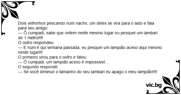 — Se você diminuir o tamanho do seu lambari eu apago o meu lampião!!!!