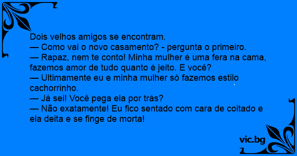 — Rapaz, nem te conto! Minha mulher é uma fera na cama, fazemos amor de tudo quanto é jeito. E você?