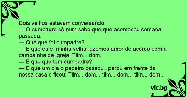 — E que eu e minha velha fazemos amor de acordo com a campainha da igreja: Tlim... dom.