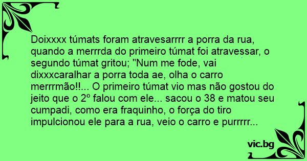 Doixxxx túmats foram atravesarrrr a роrrа da rua, quando a merrrda do primeiro túmat foi atravessar, o segundo túmat gritou; "Num me fode, vai dixxxcaralhar a роrrа toda ae, olha o carro merrrmão!!... O primeiro túmat vio mas não gostou do jeito que o 2º falou com ele... sacou o 38 e matou seu cumpadi, como era fraquinho, o força do tiro impulcionou ele para a rua, veio o carro e purrrrr...