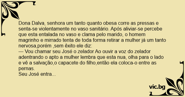 Dona Dalva, senhora um tanto quanto obesa corre as pressas e senta-se violentamente no vaso sanitário. Após aliviar-se percebe que esta entalada no vaso e clama pelo marido, o homem magrinho e mirrado tenta de toda forma retirar a mulher já um tanto nervosa,porém ,sem êxito ele diz: