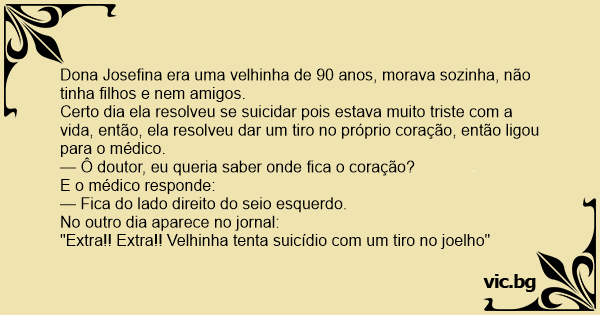Certo dia ela resolveu se suicidar pois estava muito triste com a vida, então, ela resolveu dar um tiro no próprio coração, então ligou para o médico.