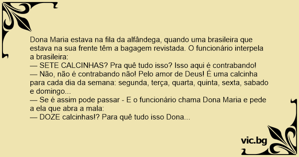 — Não, não é contrabando não! Pelo amor de Deus! É uma calcinha para cada dia da semana: segunda, terça, quarta, quinta, sexta, sabado e domingo...