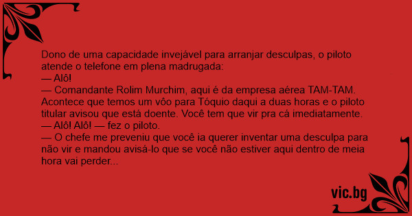 — Comandante Rolim Murchim, aqui é da empresa aérea TAM-TAM. Acontece que temos um vôo para Tóquio daqui a duas horas e o piloto titular avisou que está doente. Você tem que vir pra cá imediatamente.