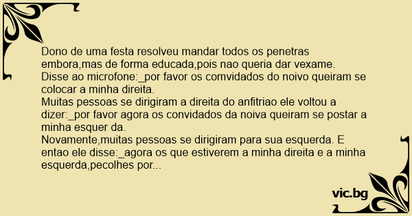 Novamente,muitas pessoas se dirigiram para sua esquerda. E entao ele disse:_agora os que estiverem a minha direita e a minha esquerda,pecolhes por favor que se retirem,porque esta nao e uma festa de casamento,e sim de batizado.