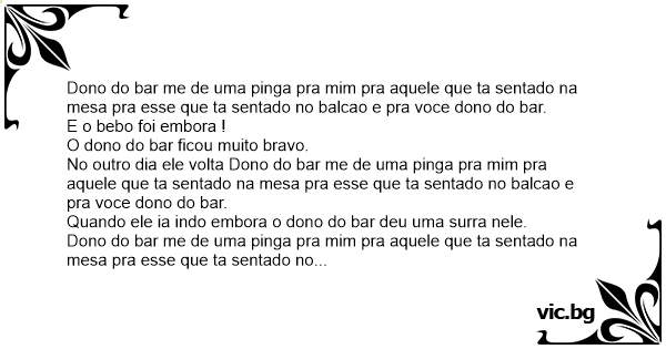 Dono do bar me de uma pinga pra mim pra aquele que ta sentado na mesa pra esse que ta sentado no balcao e pra voce nao dono do bar por que quando voce bebe fiса muito violento.