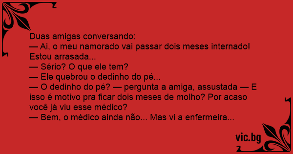 — O dedinho do pé? — pergunta a amiga, assustada — E isso é motivo pra ficar dois meses de molho? Por acaso você já viu esse médico?