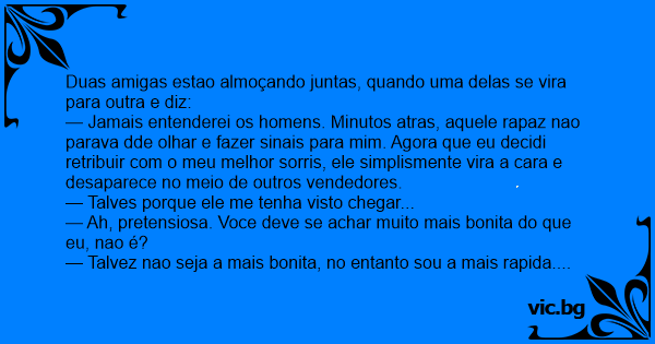 Duas amigas estao almoçando juntas, quando uma delas se vira para outra e diz: