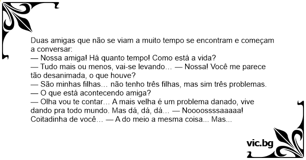 — Olha vou te contar… A mais velha é um problema danado, vive dando pra todo mundo. Mas dá, dá, dá… — Noooossssaaaaa! Coitadinha de você… — A do meio a mesma coisa... Mas dá, dá, dá… — Já sei, a caçula é a mesma coisa!