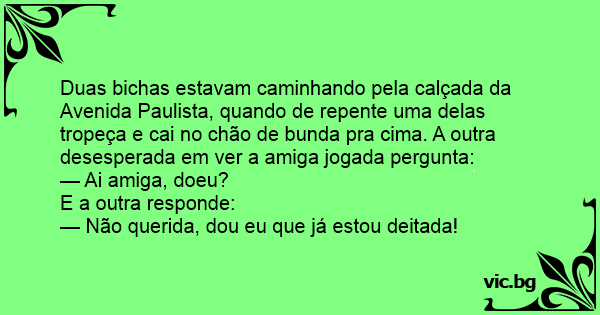 Duas bichas estavam caminhando pela calçada da Avenida Paulista, quando de repente uma delas tropeça e cai no chão de bunda pra cima. A outra desesperada em ver a amiga jogada pergunta: