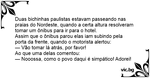 Duas bichinhas paulistas estavam passeando nas praias do Nordeste, quando a certa altura resolveram tomar um ônibus para ir para o hotel.